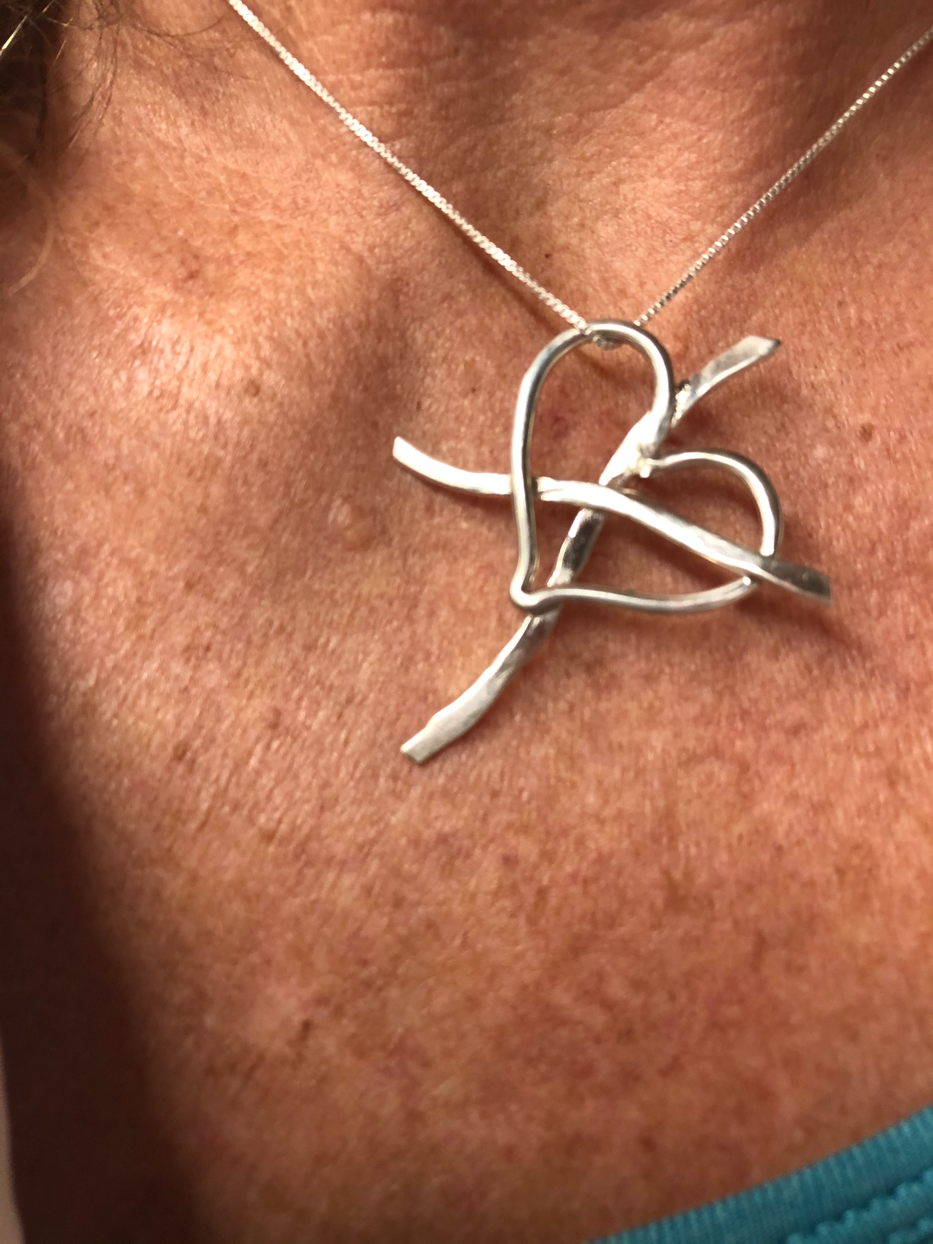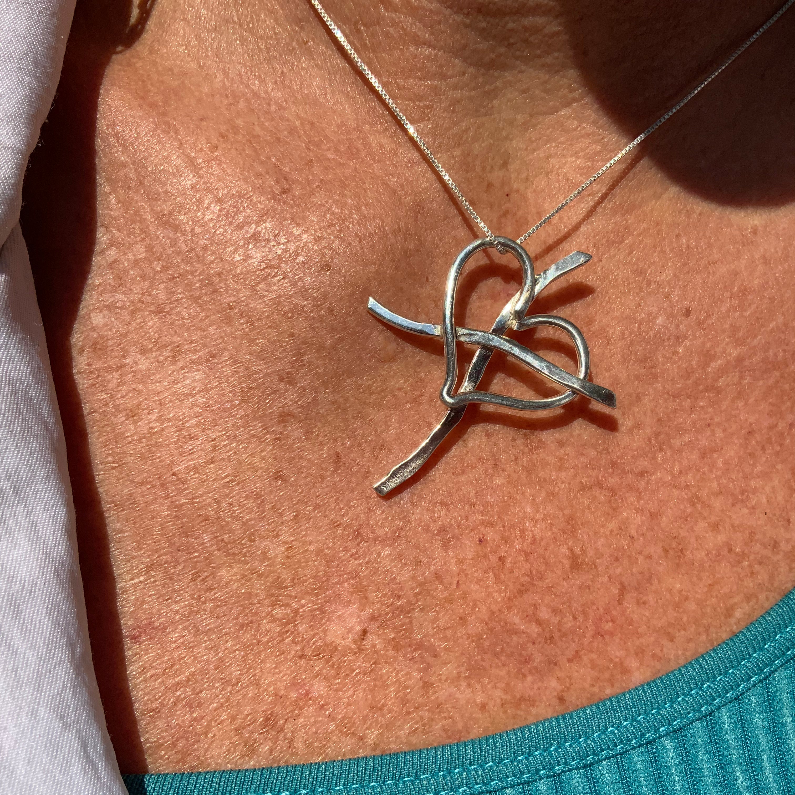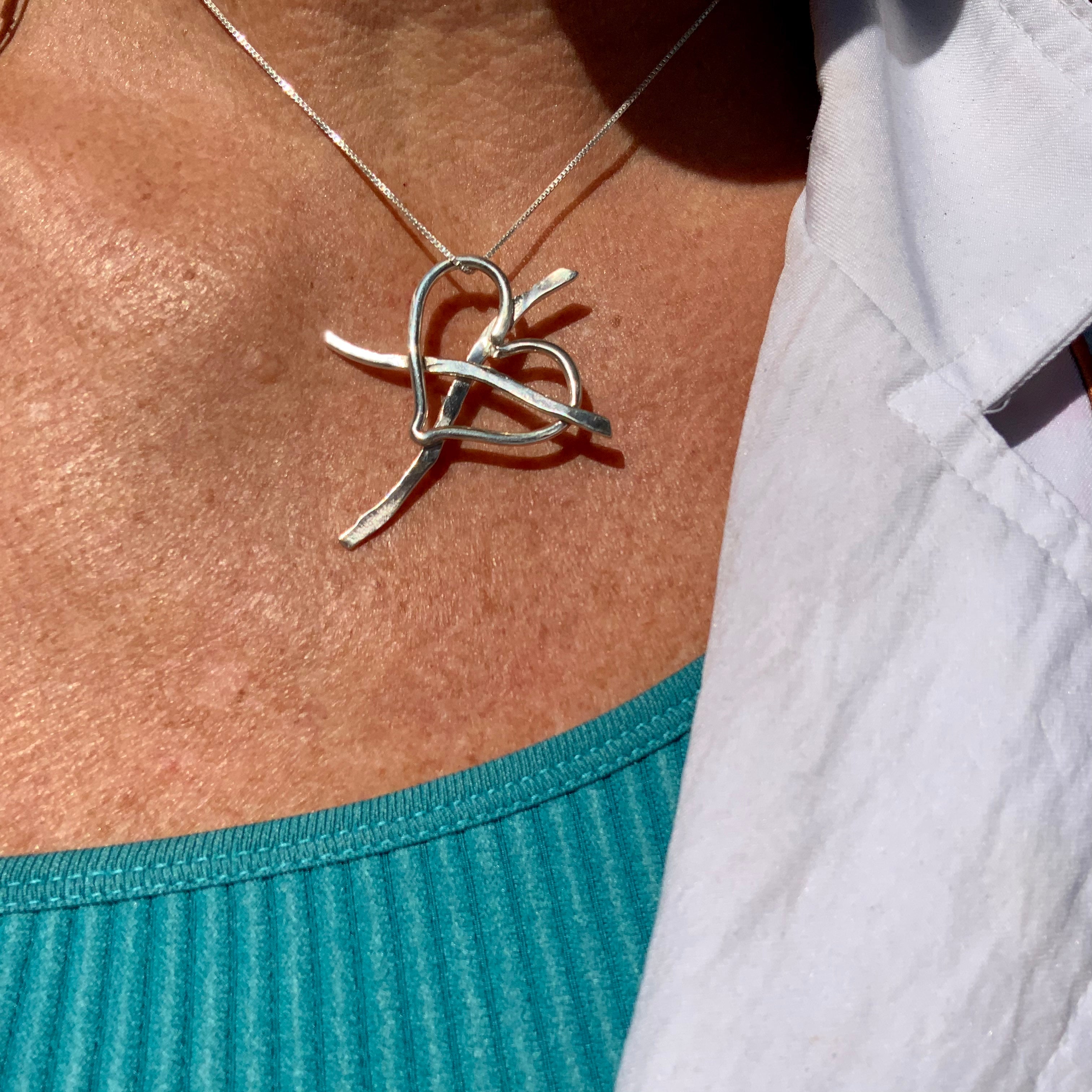 This beautiful heart with the cross pendant is hand forged by Shug. Made of solid 925 sterling silver. Delicately hammered for texture as seen in the pictures. Made to compliment the Christ collection. About 2 inches wide and 2 inches long.