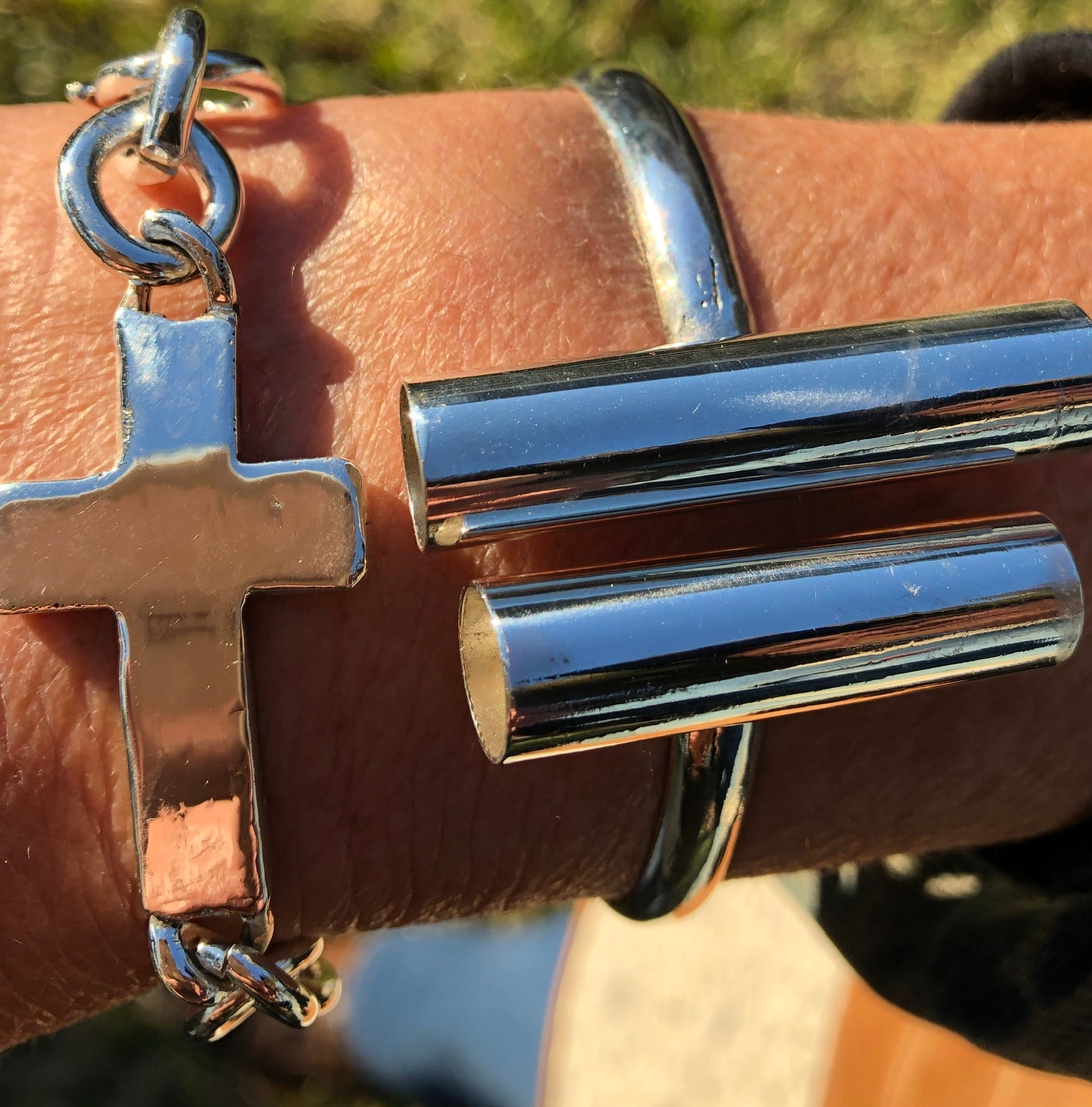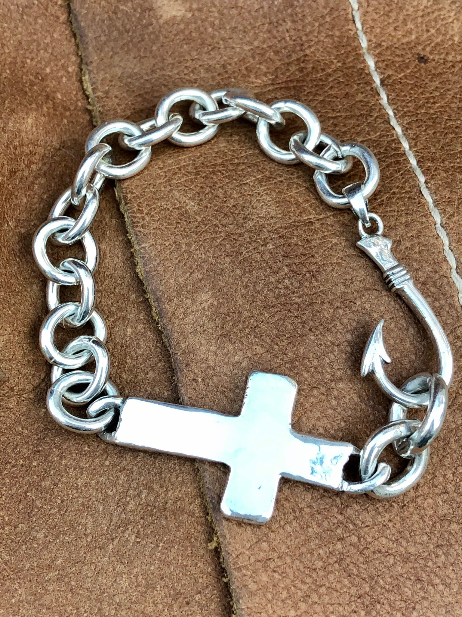 Custom handmade bracelet made for men and women, All made with the finest Sterling silver in the USA. The chain has solid links and the cross length is 1.5 inches. The hook is 1.0 inches. The bracelet comes in various sizes, Ffom 6.5 to 8.0 inches. The clasp is the hook and fits perfectly into the links.