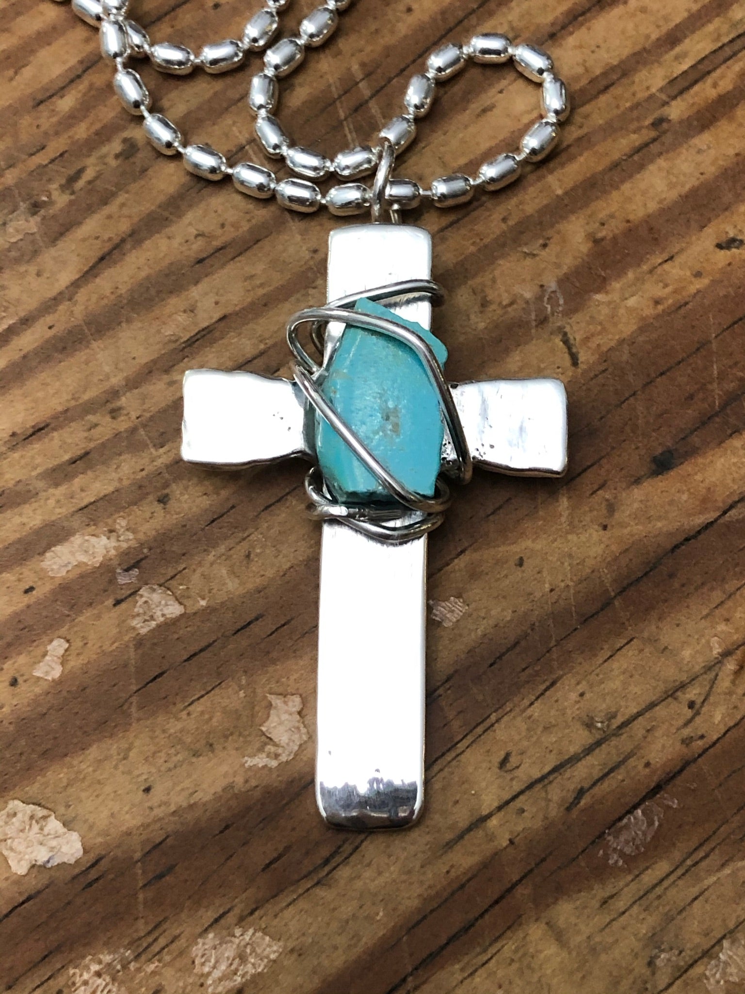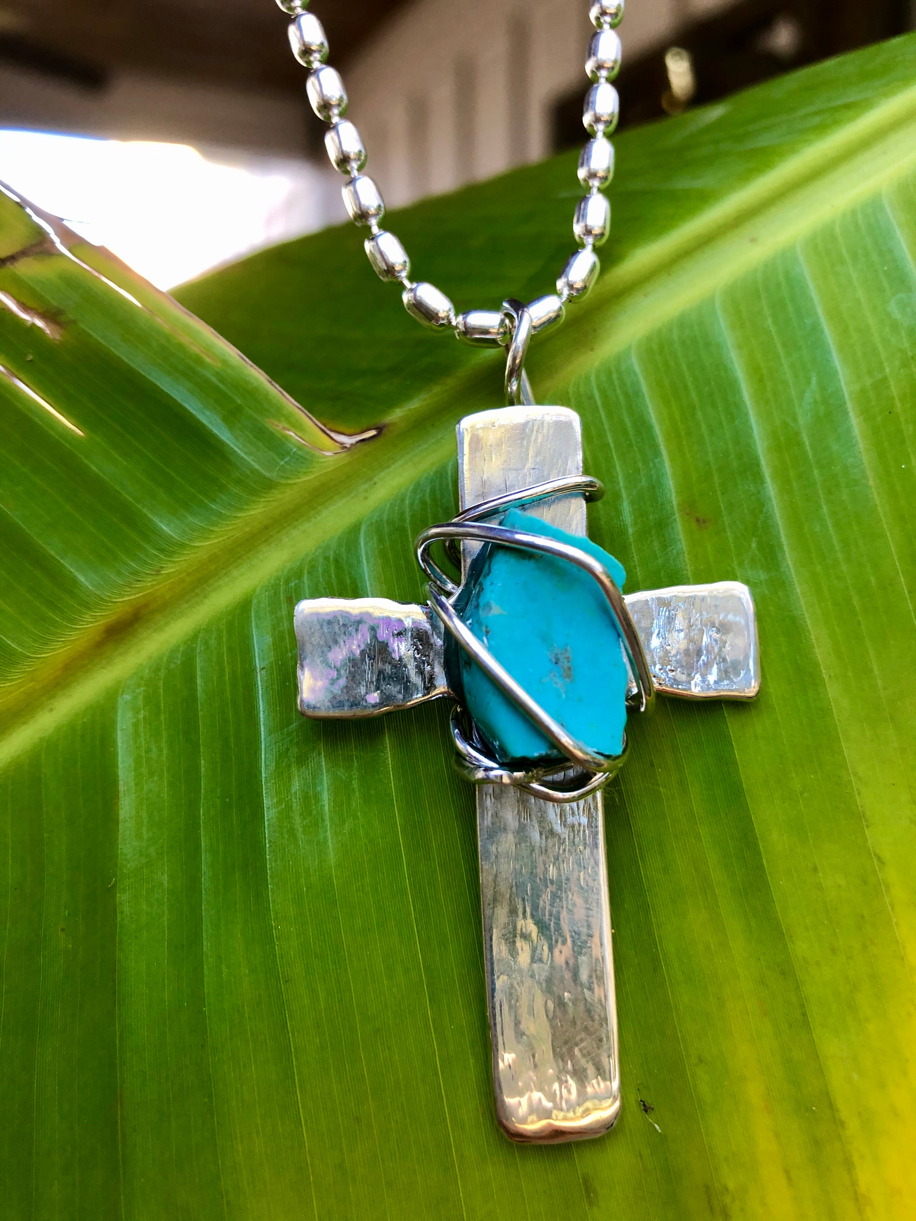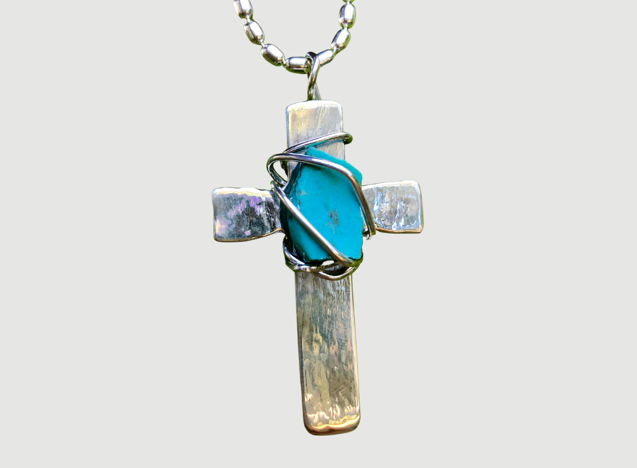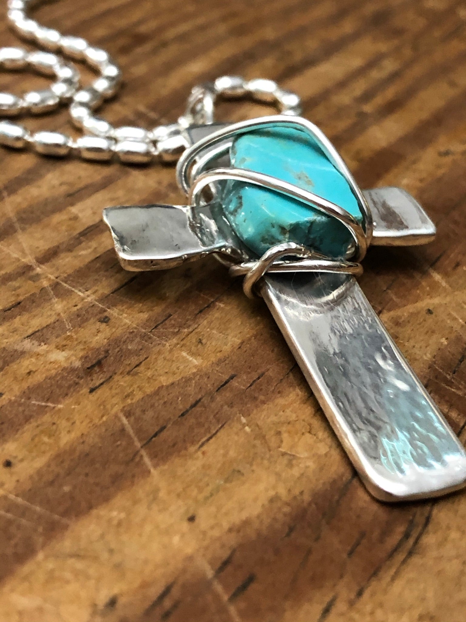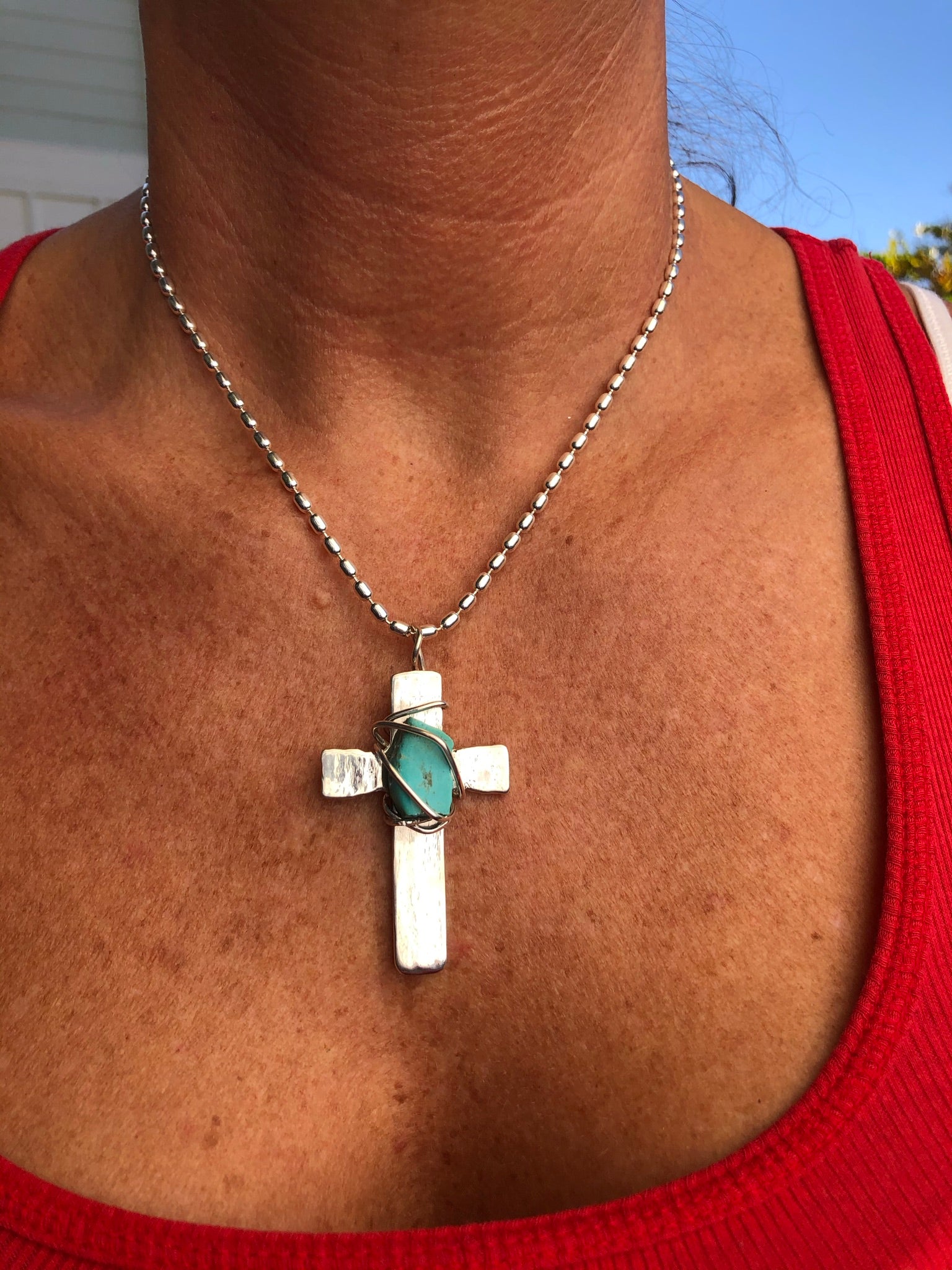 Beautiful substantial Sterling Silver cross made with the finest sterling. A lifetime piece that will be cherished for generations. Turquoise from New Mexico and Arizona that is hand cut by Shug. Accented with hand wrapped sterling silver. All custom by Shug~