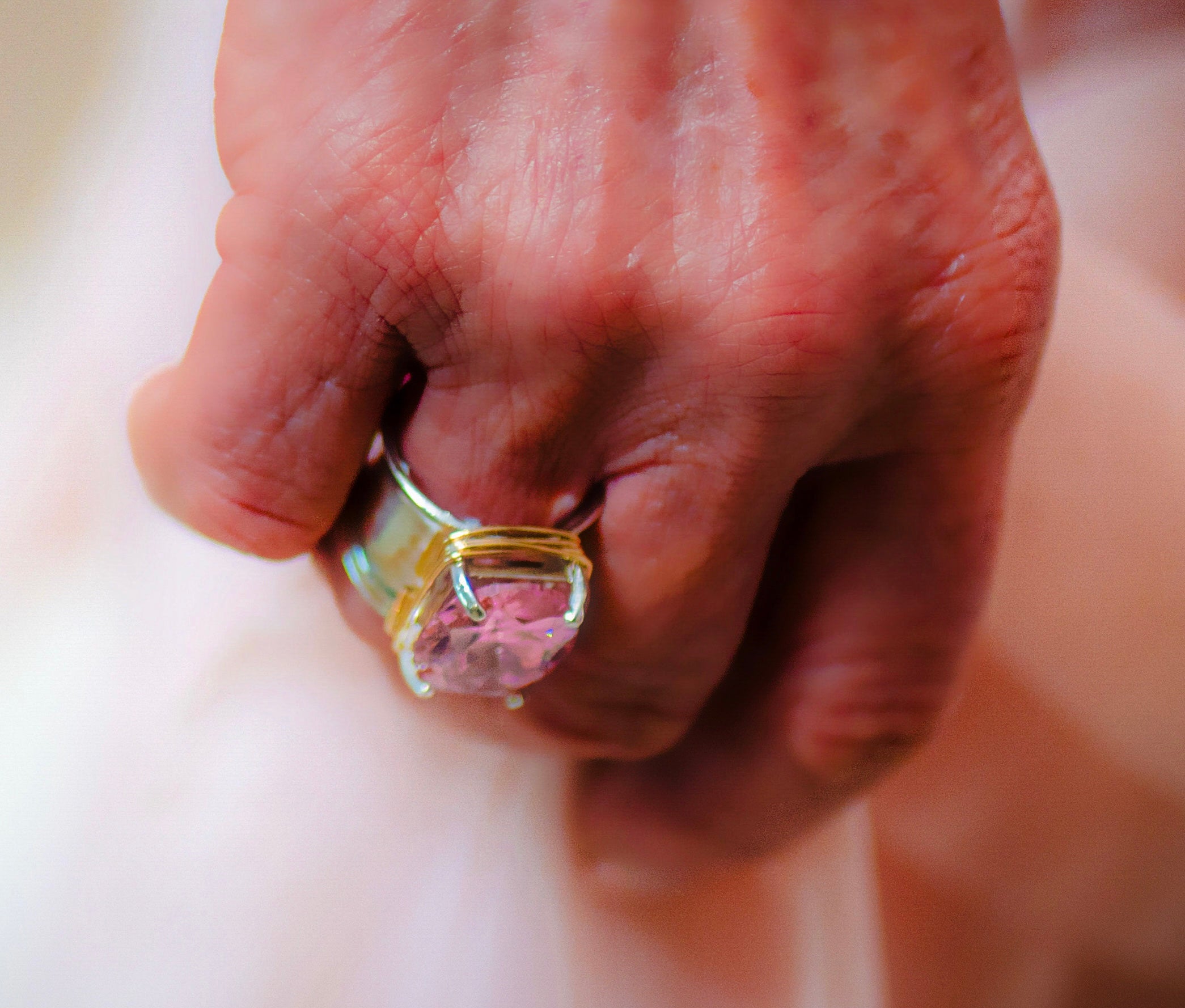 Vibrant pink hue of the 15-carat Pink Topaz gemstone set in a refined sterling silver band, wrapped in gold, creating a perfect blend of sophistication and glamour.